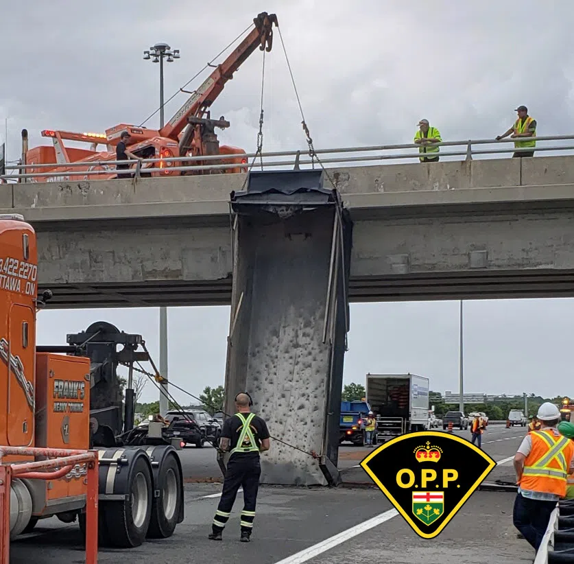 The collision forced the closure of Highway 417 at Huntmar Drive as a large dump box truck the overpass and became wedged.