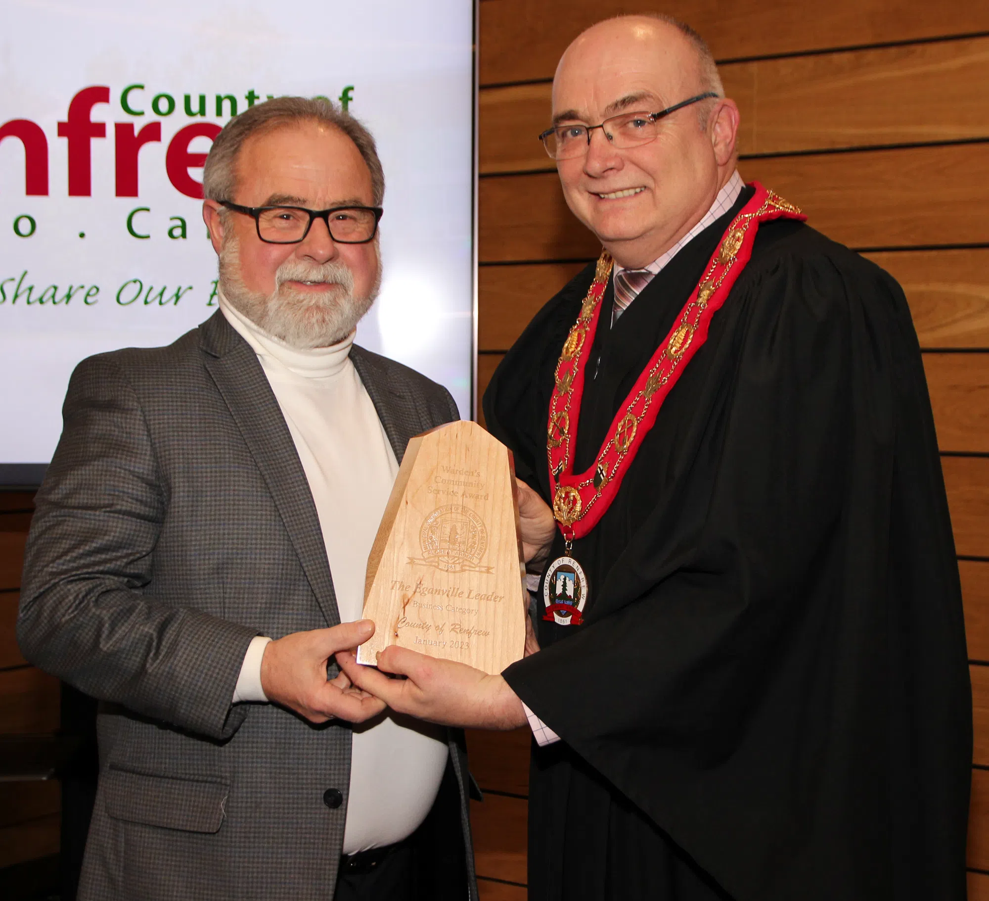 The Eganville Leader was recognized as the winner of the business category for the 2022 Warden’s Community Services Awards, which were presented January 25 at County Council. Eganville Leader publisher Gerald Tracey (left) accepted the award from Renfrew County Warden Peter Emon. County of Renfrew photo