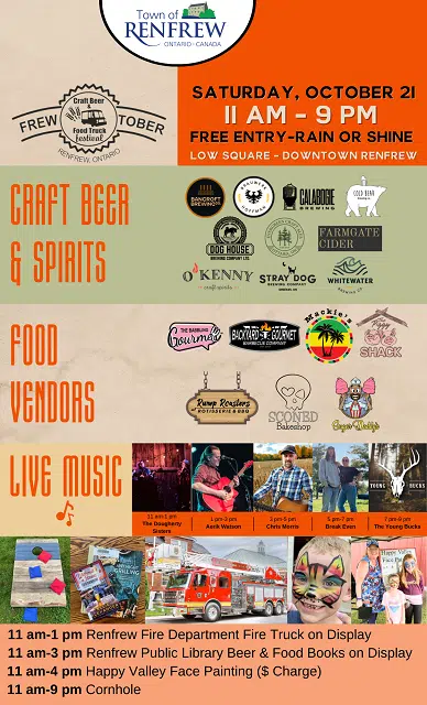 Renfrew’s Craft Beer and Food Truck Festival will take over Low Square outside Town Hall from 11:00 a.m. to 9:00 p.m. on Saturday, October 21st, for what town Programming Coordinator Janyne Fraser is calling celebration full of local food, live music, and plenty of beer with a connection that’s close to home.