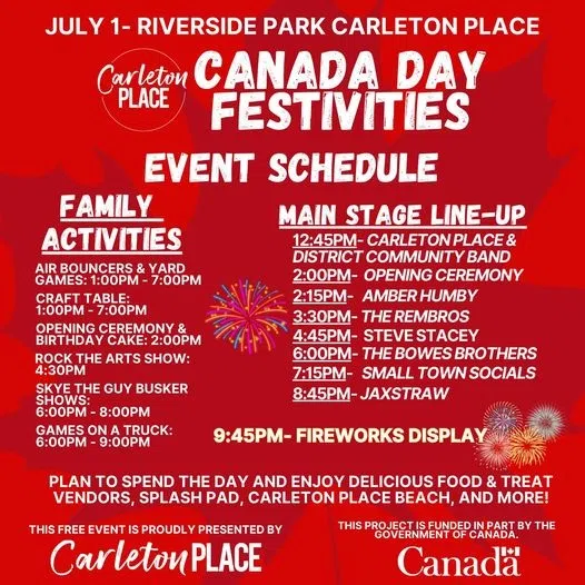 Canada Day 2024 in Carleton Place is occurring along the banks of the Mississippi River and involves an assortment of live music, food, and family fun from 12:30PM to 10:15PM.