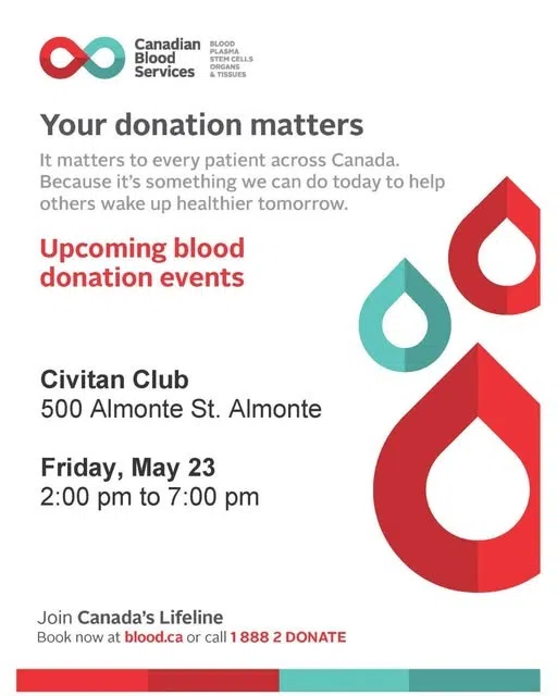 Give the gift of life! Canadian Blood Services and the Almonte Civitran Club are hosting a blood donor clinc today at the Civitan Hall in Almonte, from 2-7PM.