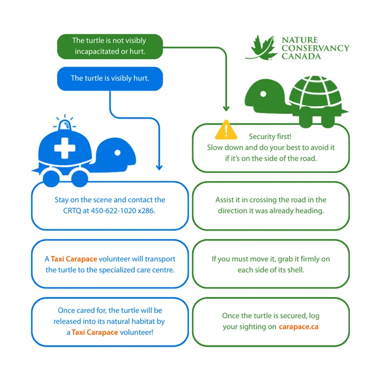 To report a turtle sighting or learn more, visit carapace.ca. If you see a turtle that looks injured or in danger, stay nearby and contact the CRTQ immediately.