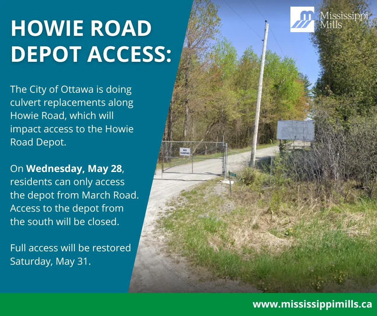 The Municipality of Mississippi Mills indicates that access to its Howie Road Waste and Recycle Depot will be blocked from Wednesday through this Friday.