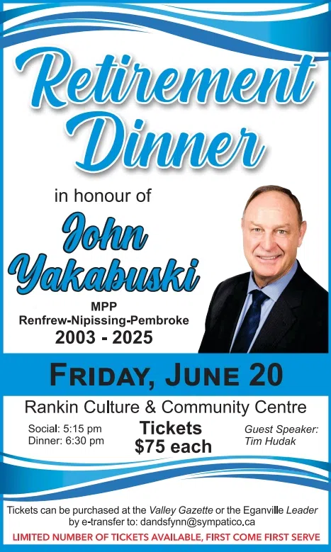 A special Retirement Dinner will be held on Friday, June 20, to honour John Yakabuski, Member of Provincial Parliament (MPP) for Renfrew–Nipissing–Pembroke, who retired after serving the community from 2003 to 2025.