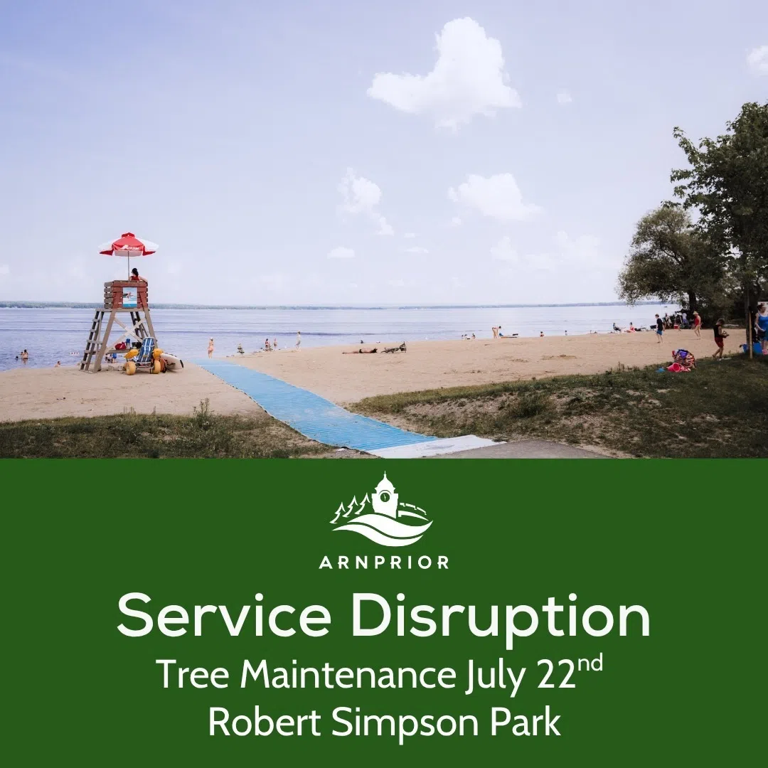 Arnprior Public Works will be completing tree maintenance at Robert Simpson today, from 7:00 am to 4:00 pm.