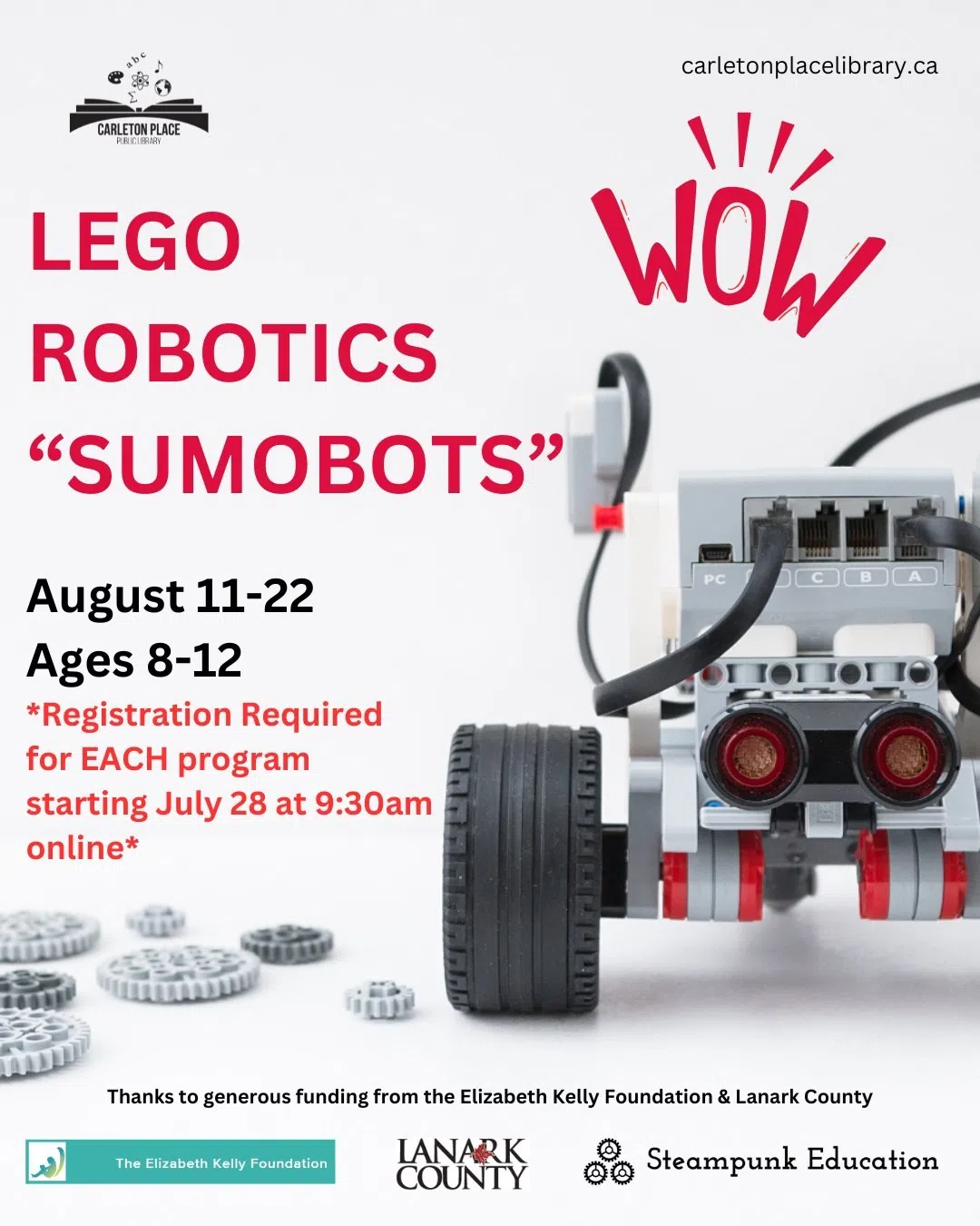 The Library will be hosting two weeks of Lego Sumobots, and asks that you only register your child for TWO of the Sumobots sessions maximum so that everyone has a chance to take part.