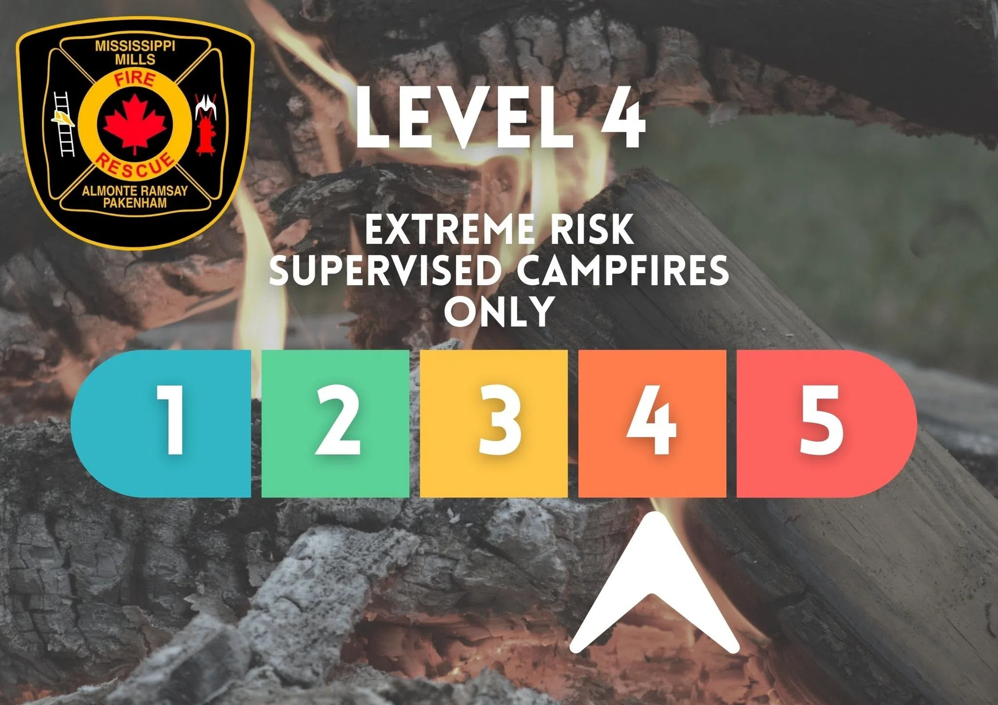 The Mississippi Mills Fire Department (MMFD) has elevated the Municipality’s burning status to Level 4 – Partial Burn Ban (Extreme Risk). The Partial Burn Ban only permits campfires in the Municipality throughout areas that are permitted to burn. All non-campfire burning is strictly prohibited. Supervised campfires are strongly advised. You are required to have extinguishing agents immediately available.