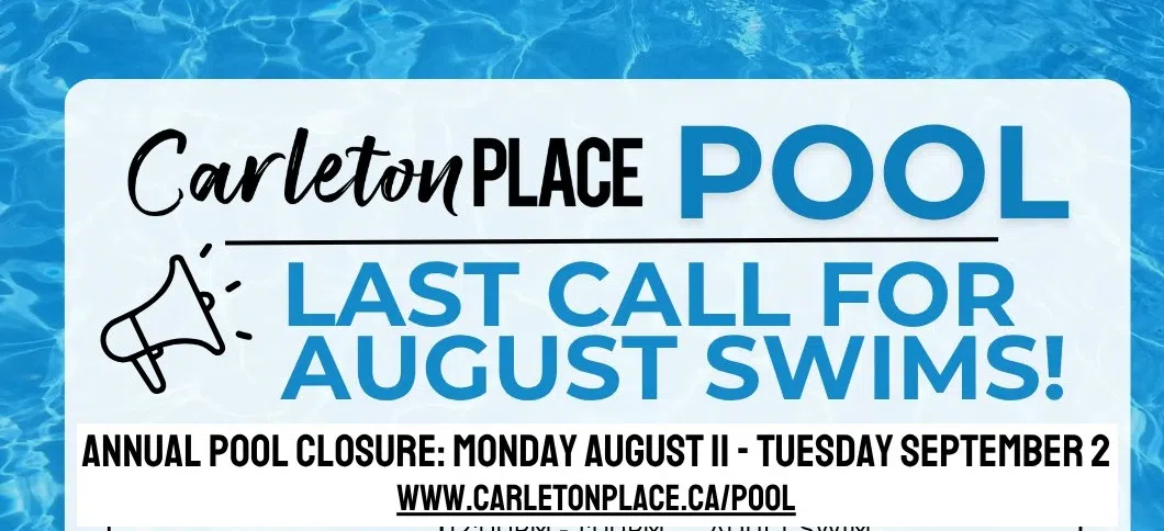 It’s time for the annual maintenace shut-down at the Carleton Place Pool, and the facility will be closed for maintenance starting on Monday, August 11th (today) and reopening on Tuesday, September 2nd.