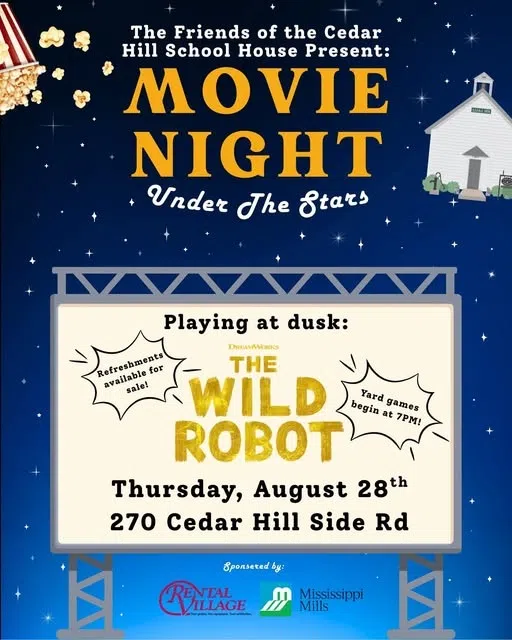 Come see “The Wild Robot” under the stars with the Friends of Cedar Hill Schoolhouse next Thursday (August 28th) at dusk at the venue on 270 Cedar Hill Side Road.