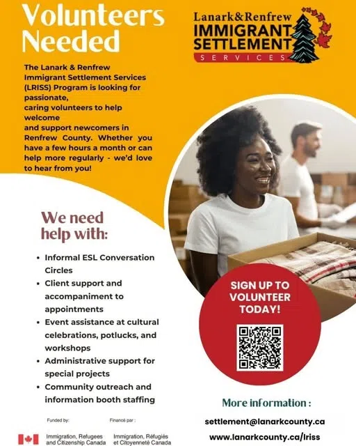 The Lanark & Renfrew Immigrant Settlement Services Program is looking for help supporting newcomers in the following areas: Informal ESL Conversation Circles, Client support and accompaniment to appointments, Event assistance, Administrative support, Community outreach and information booth staffing.