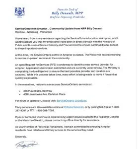 Renfrew-Nipissing-Pembroke MPP Billy Denault is concerned about the lack of an operative Service Ontario location for Arnprior, and indicates his office is working with colleagues at the Ministry of Public and Business Service Delivery and Procurement to rectify the situation.