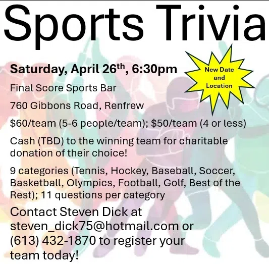 New Date and Location! Saturday, April 26th, 6:30pm Final Score Sports Bar 760 Gibbons Road, Renfrew $60/team (5-6 people/team); $50/team (4 or less) Cash (TBD) to the winning team for charitable donation of their choice! 9 categories (Tennis, Hockey, Baseball, Soccer, Basketball, Olympics, Football, Golf, Best of the Rest); 11 questions per category. Contact Steven Dick at steven_dick75@hotmail.com or (613) 432-1870 to register your team today!